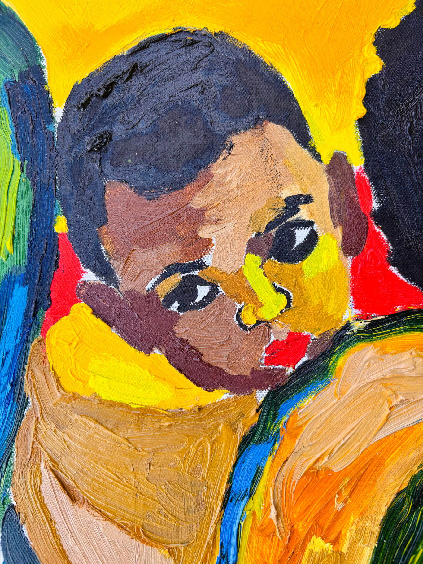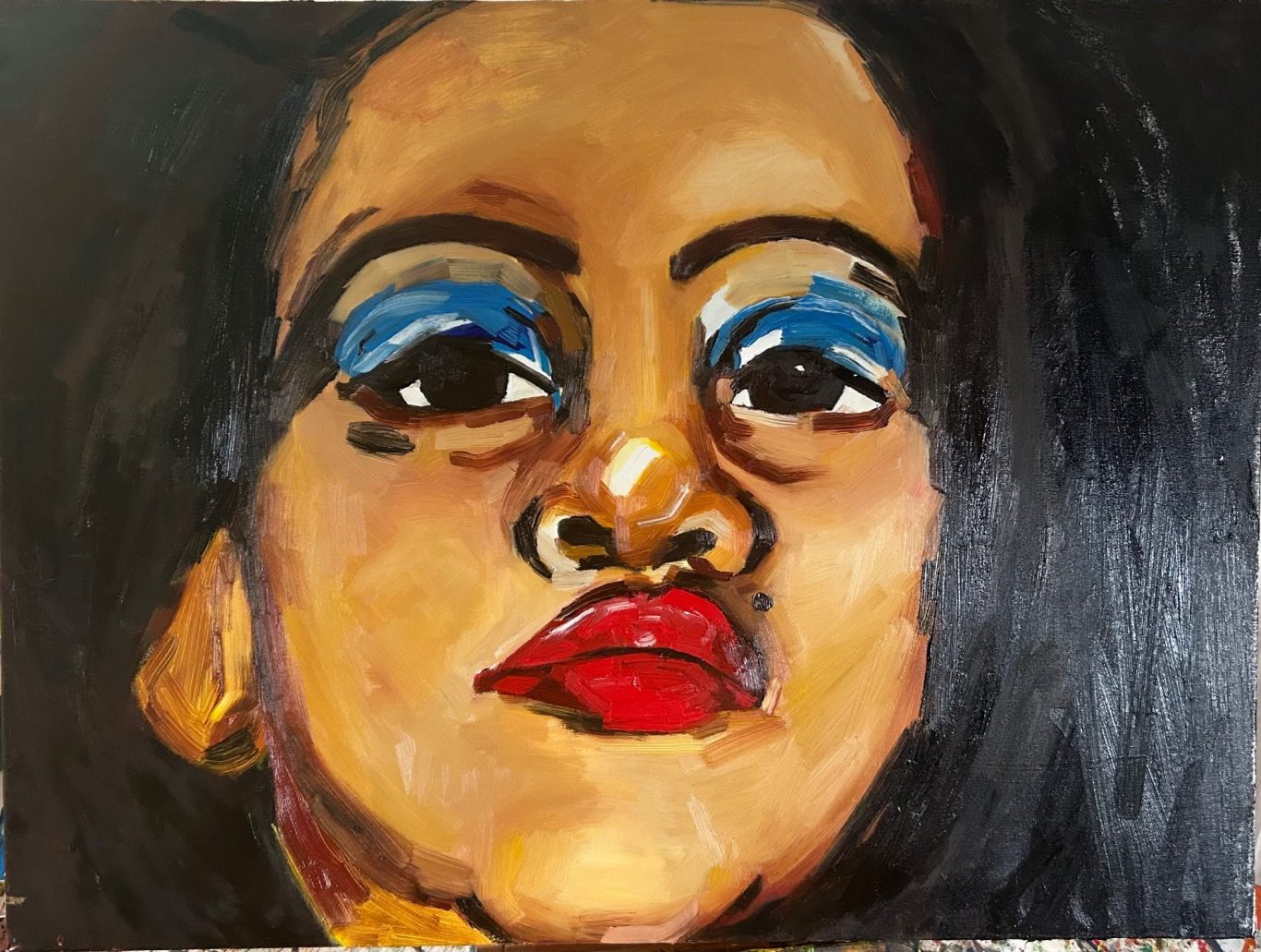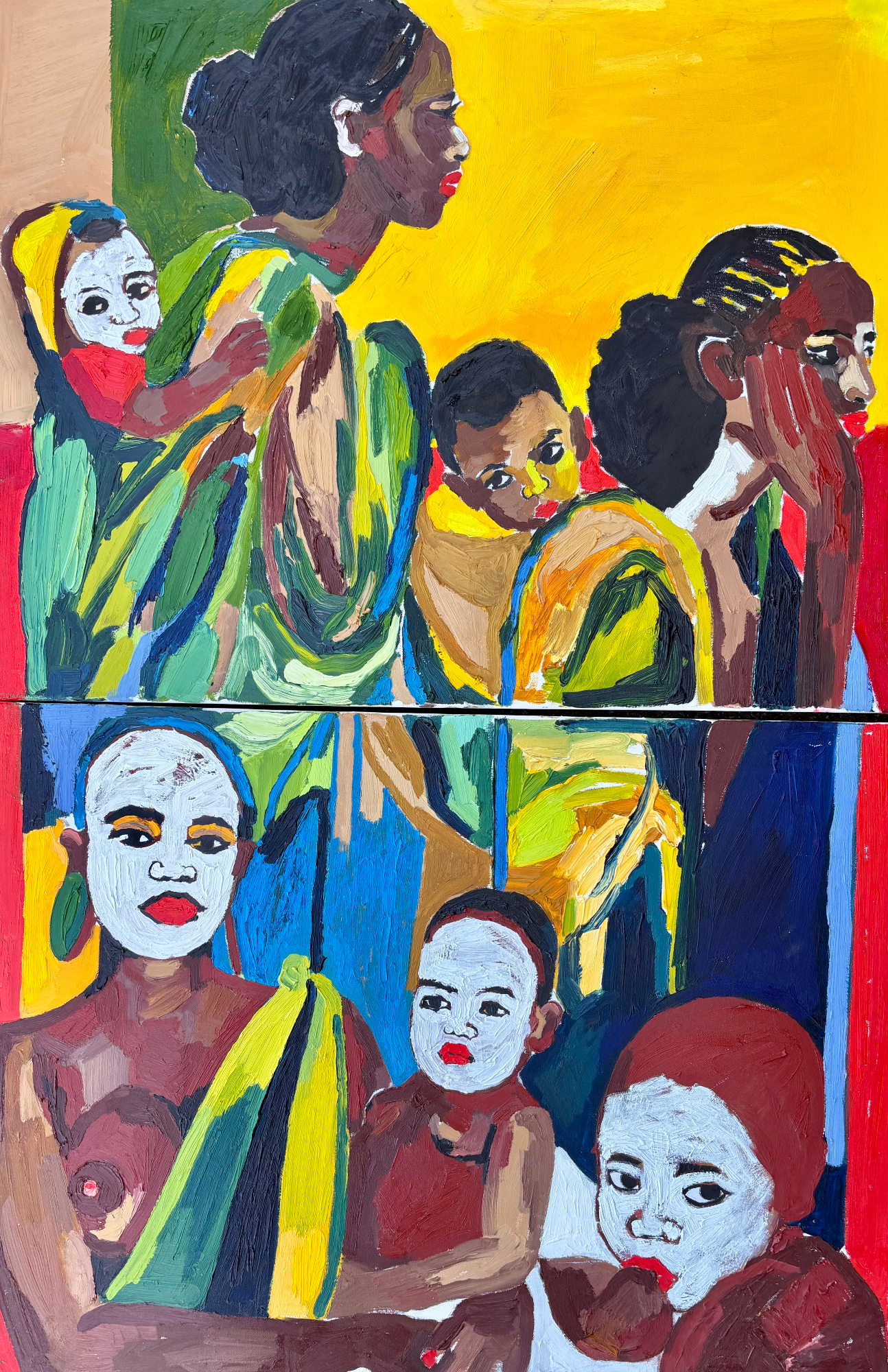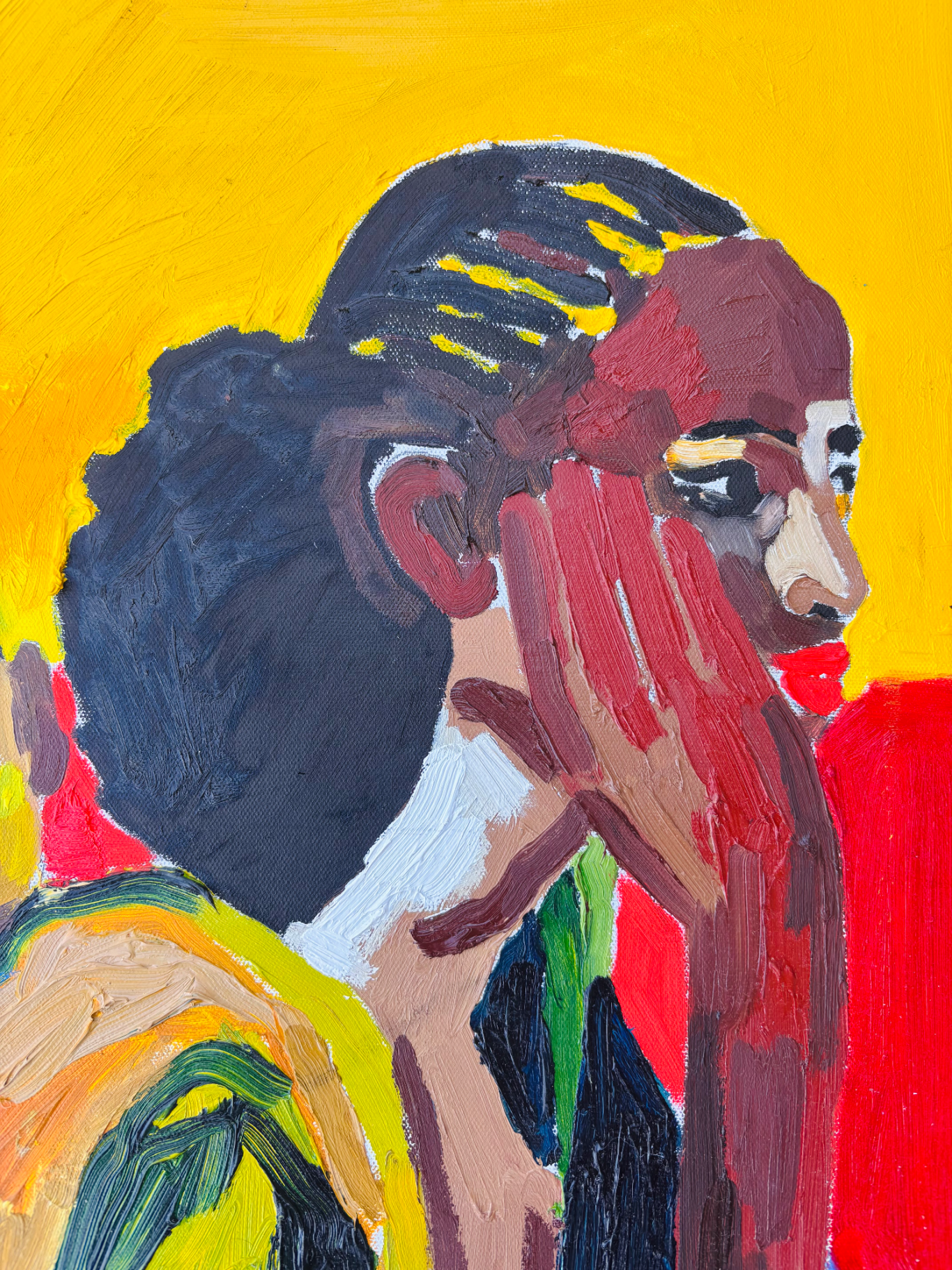 Afrassa’s portraits celebrate the people of the sun with rich, radiant skin and honest, direct gazes. Through bold colour and layered surface, the work honours skin as living texture and identity, capturing presence, resilience and the powerful tension of being seen.